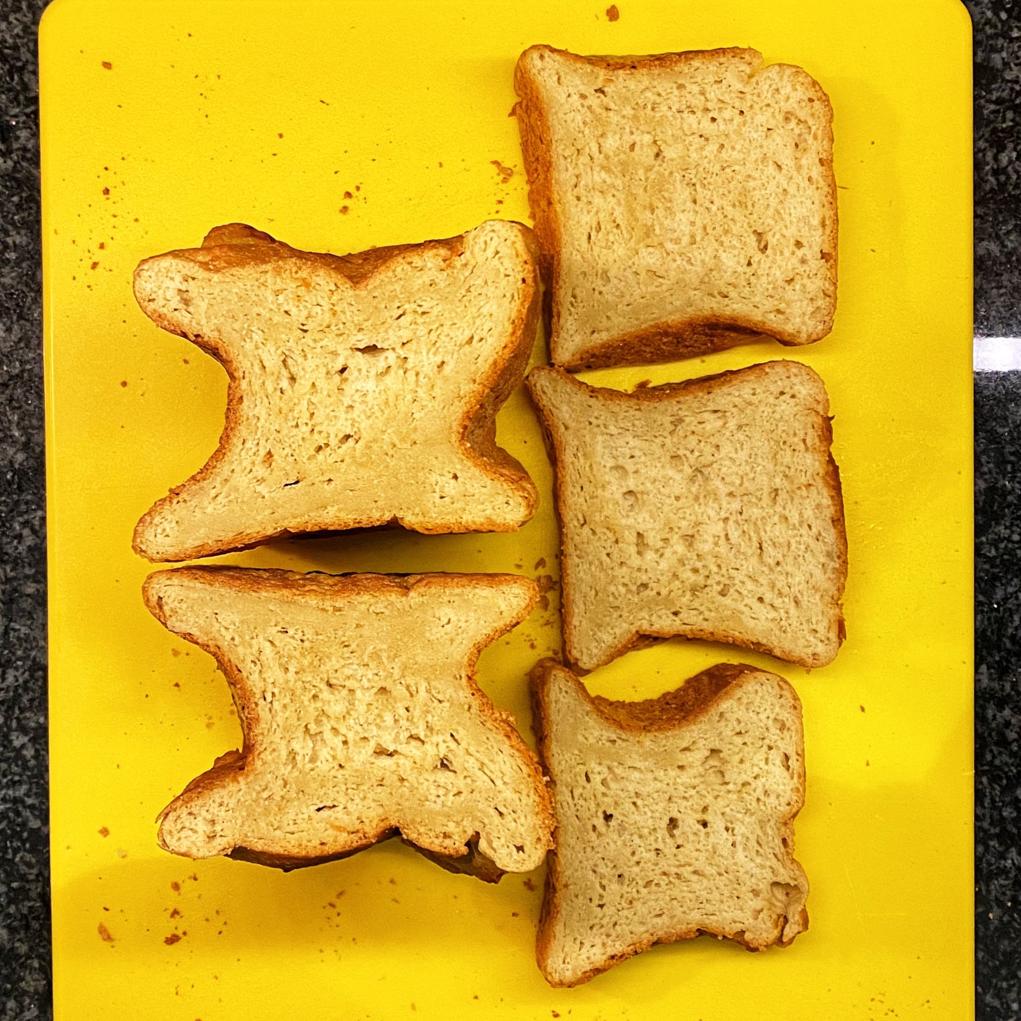 Loaf completely collapsed in the centre. Sad face. Top of loaf did brown on the lid of pullman pan but sank down again. Probably due to oven temperature being too low. Will try with higher temperature next time to set the proteins faster.