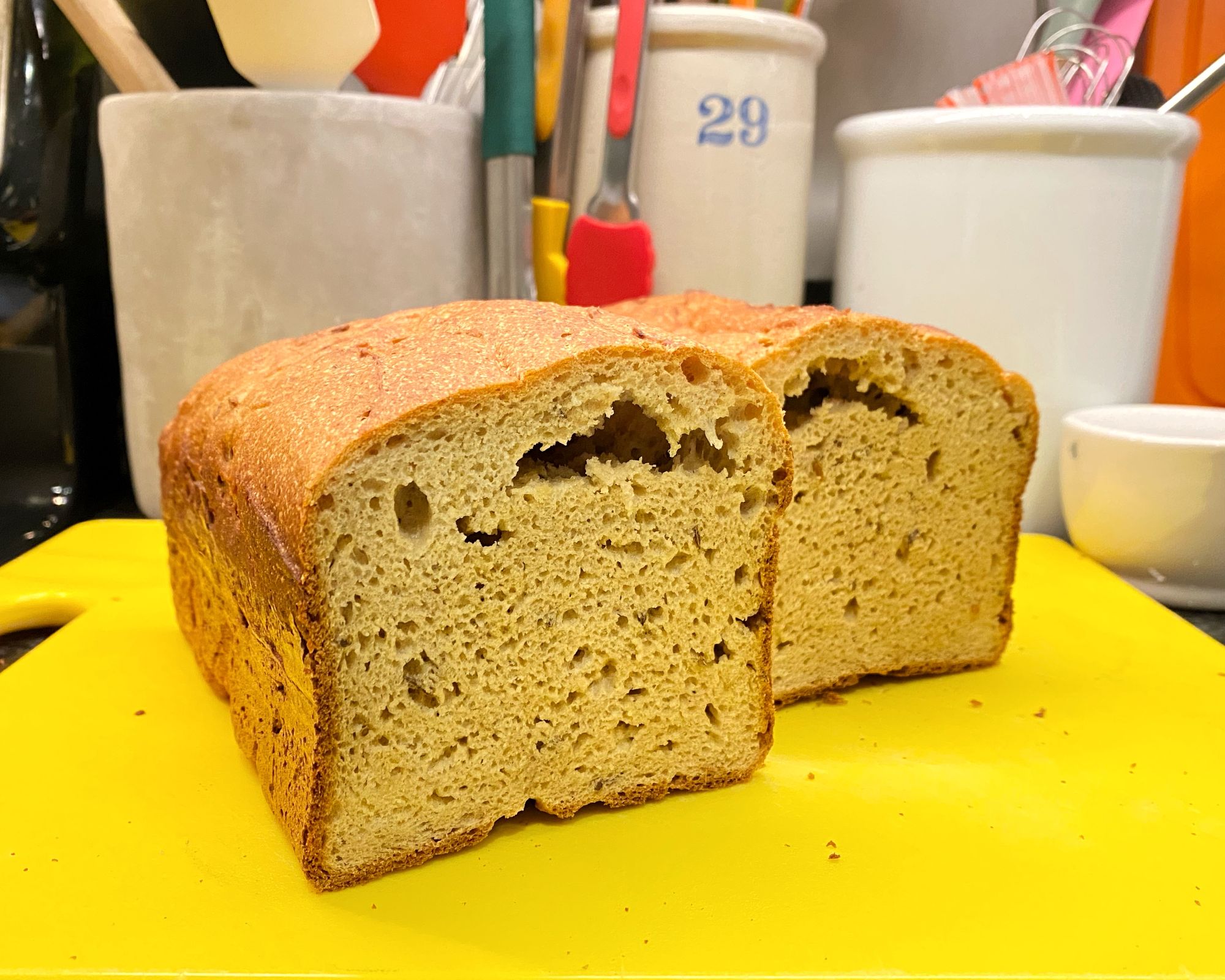 A good neutral quick-yeasted bread flavour. A nice balance between nuttiness, earthiness, sweetness, and umami. Not eggy tasting. Crumb is still a bit more brittle than traditional wheat bread but held together well and was moist given it is a gluten-free loaf. Extra caraway is always good.